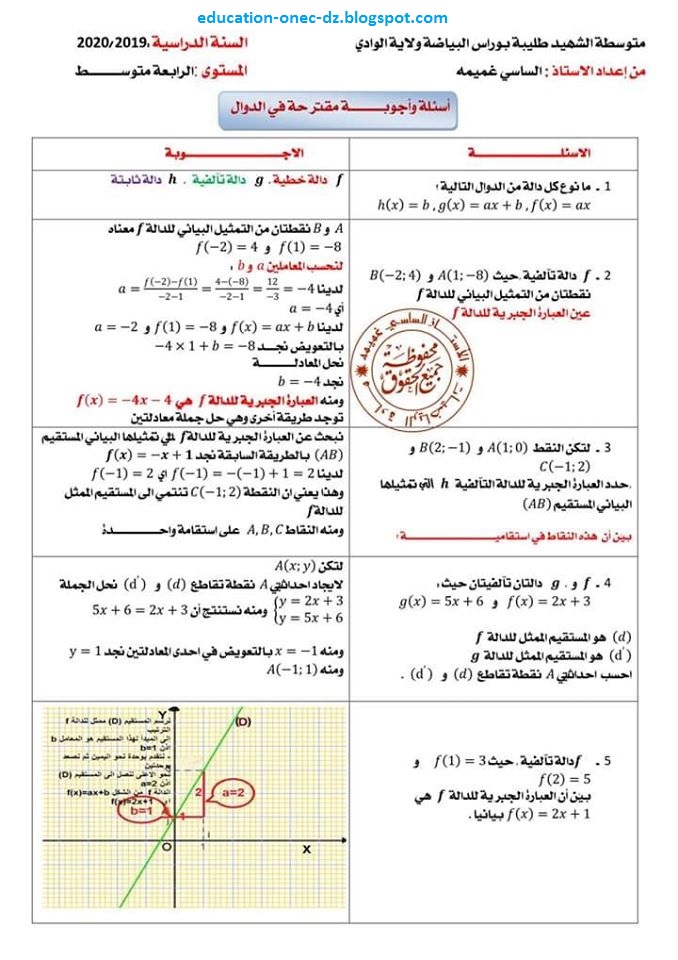 أسئلة واجوبة مقترحة في الدوال رياضيات السنة الرابعة متوسط الجيل الثاني